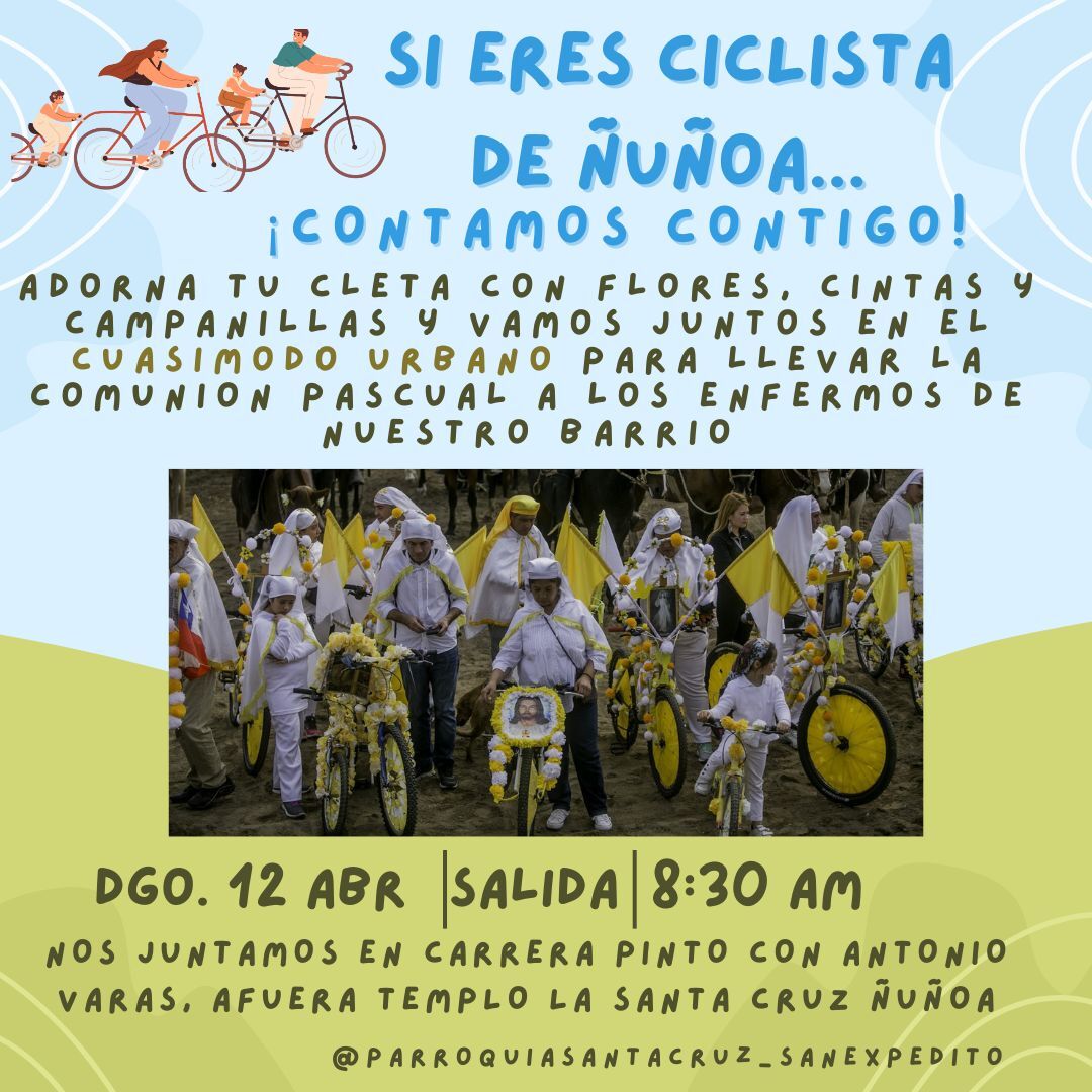 Este domingo 12 de abril, a las 08:30 horas, nos encontraremos en las afueras del templo parroquial de La Santa Cruz - Ñuñoa, santuario de san Expedito, para llevar la comunión pascual a los enfermos y personas postradas del sector. Invitamos a los ciclistas de Ñuñoa de todas las edades a participar, decorando previamente sus bicicletas con cintas y flores blancas y amarillas, banderas o emblemas chilenos, campanillas o sonajeros.