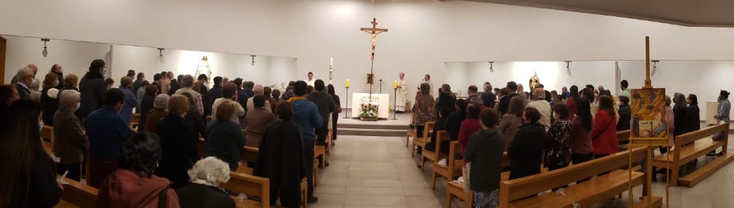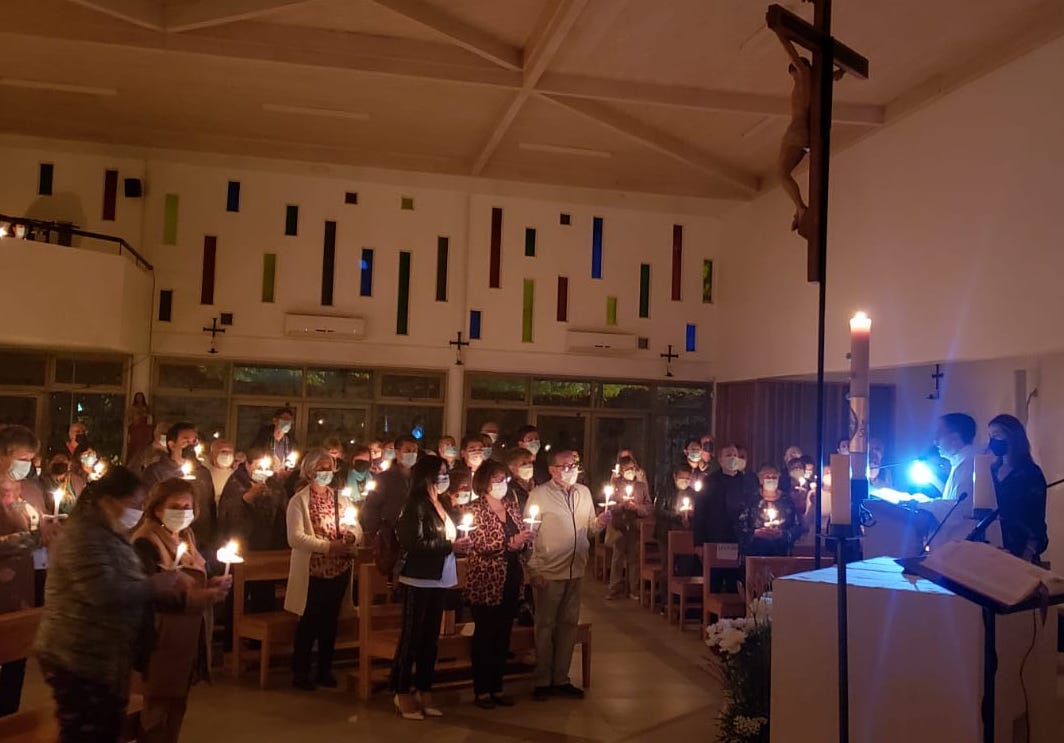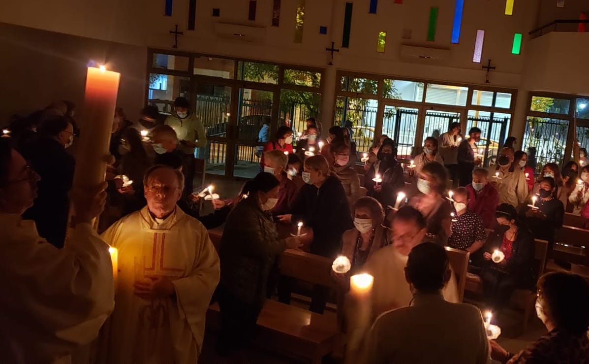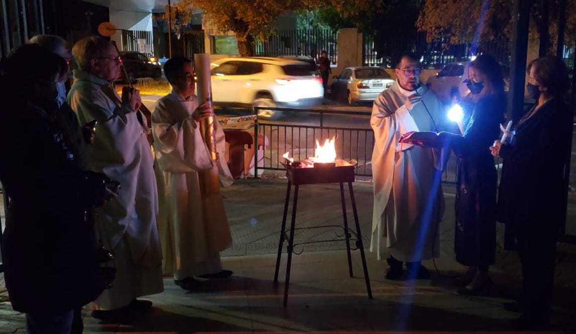 La solemne Vigilia de Pascua se celebró este Sábado Santo desde las 20 horas en el exterior de nuestro santuario, con la bendición del fuego y posterior preparación del Cirio, el que fue inciensado y llevado en procesión por el interior del templo, al tiempo que la comunidad encendía sus cirios en espera de la Luz viviente. Tras la proclamación del pregón pascual, se repasó la historia de la salvación en diversas lecturas bíblicas acompañadas con sus salmos y una oración. Con el canto de Gloria los participantes aclamamos a Cristo Resucitado, se iluminó el templo y repicaron las campanas en señal de júbilo. En la eucaristía, que presidió nuestro párroco, el pbro. Juan Francisco Pinilla, concelebrando nuestro vicario parroquial, pbro. Luis Eugenio Silva, la comunidad renovó sus promesas de fe bautismales y recibió el signo del Agua que representa la vida nueva en Jesús vencedor de la muerte. Presentamos aquí la reflexión que nos entregó nuestro párroco, en su homilía.